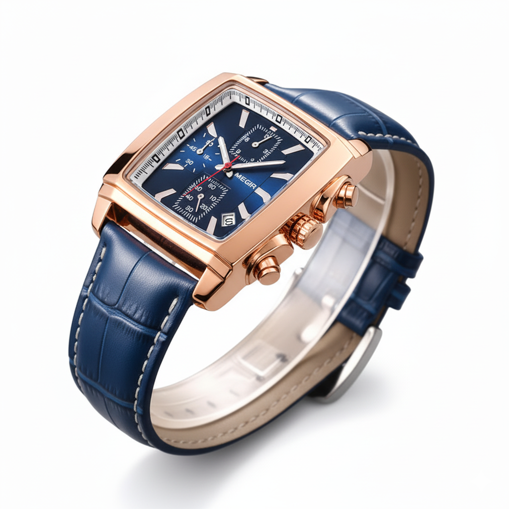 A pulseira de couro legítimo, acompanhada do fecho de fivela clássica, oferece conforto e encaixe seguro ao pulso. O acabamento refinado e os detalhes luminosos no mostrador reforçam sua presença marcante — um relógio criado para acompanhar o ritmo dinâmico e elegante do homem contemporâneo.